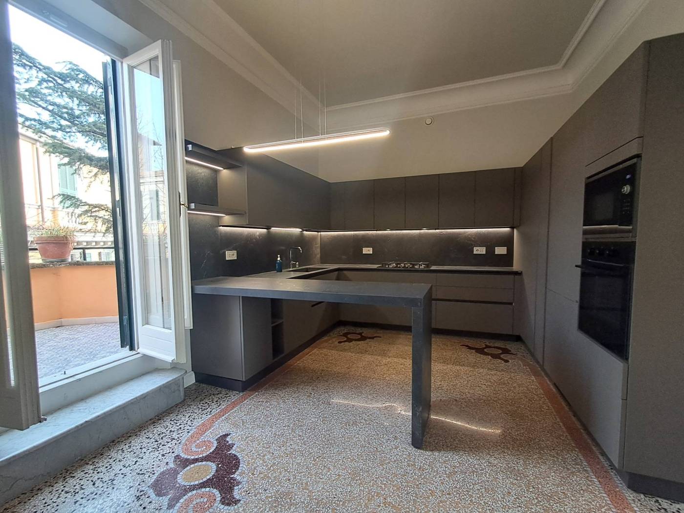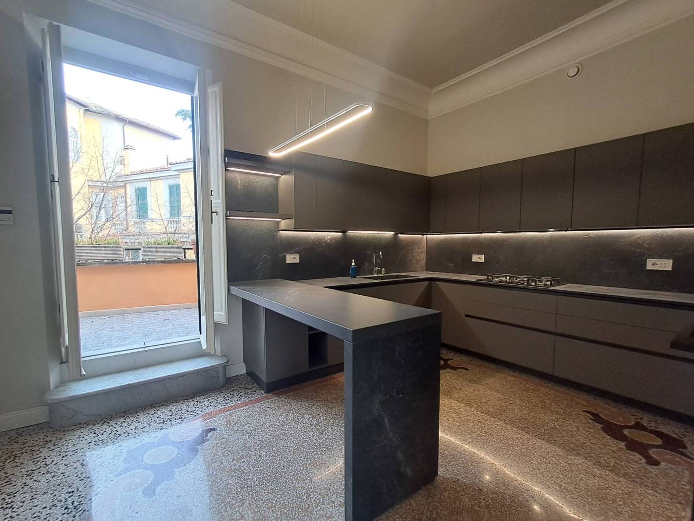 L'attico è composto da un ingresso, un salone doppio con camino e diversi balconi collegato ad una cucina arredata da una porta scorrevole.