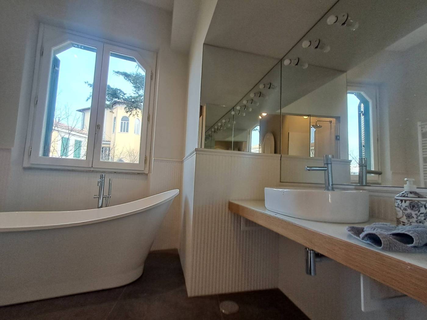 La camera da letto padronale è preceduta da una grande stanza con armadi ed ha bagno en suite con la vasca.